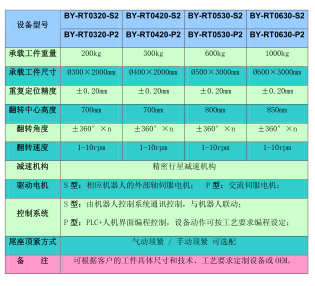 BY-RT XXXX-S(P)2系列表 點焊POS機人的內部軸-- 頭尾架式活躍旋轉變位機